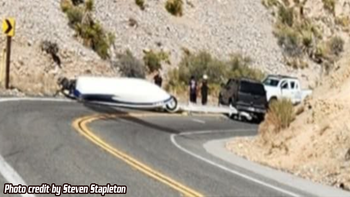 The incident happened on Hwy 18 about a mile from the Mitsubishi Cement Plant on July 26, 2025, about 3:45pm Saturday afternoon. It was reported that a dark gray Chevrolet Tahoe SUV was pulling a small fishing boat on a trailer. The driver was coming down the mountain from Big Bear Lake and lost control.