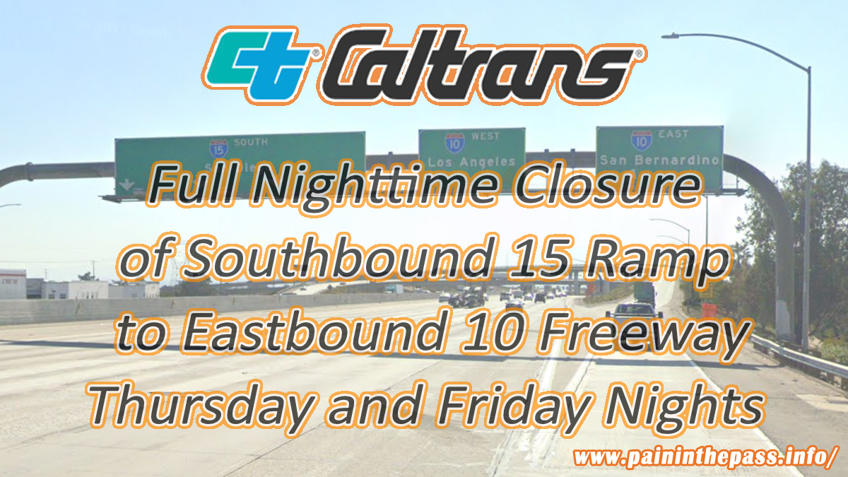 ONTARIO, CA. (Pain In The Pass) >> A full overnight closure of Interstate 15 connector I-10 freeway and ramps will take place this Thursday night and Friday night as Caltrans doing bridge repair.