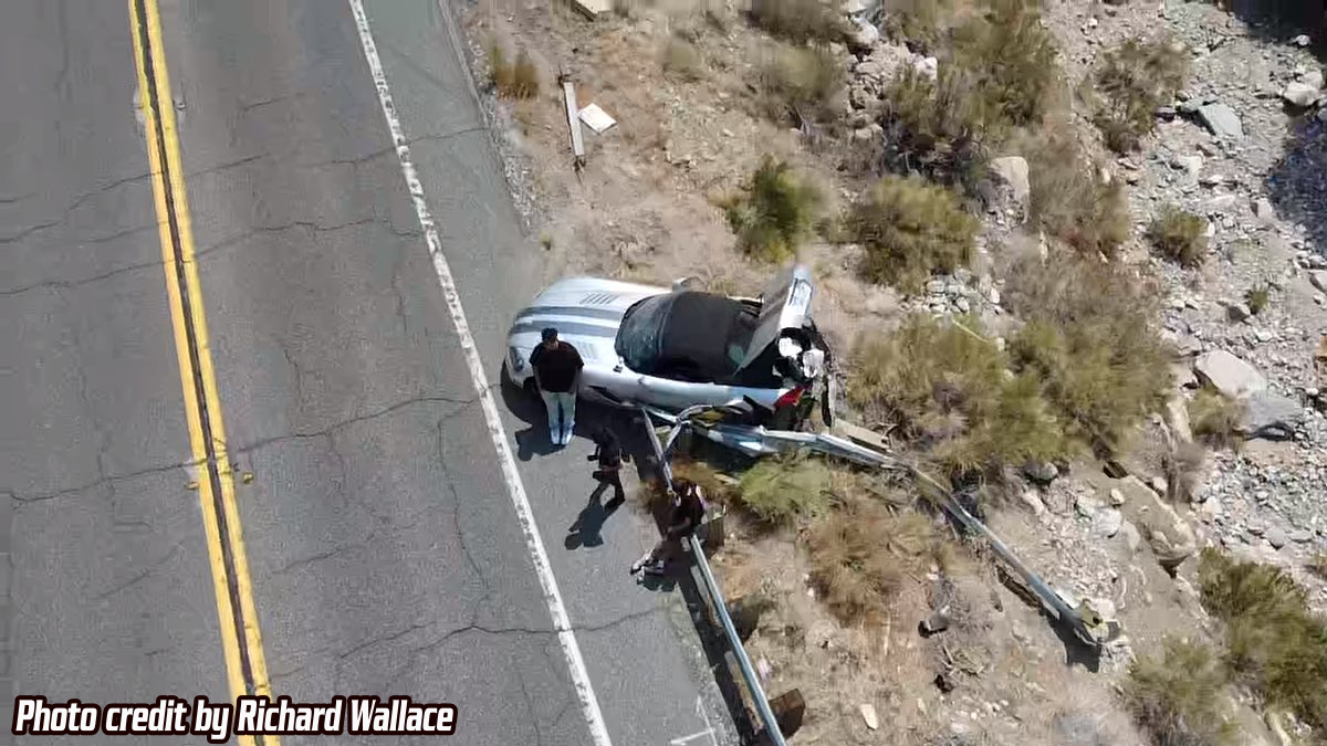 The crash happened on Hwy 18 about a mile from the Mitsubishi Cement Plant on August 3, 2025, about 2:11pm Sunday afternoon. It was reported that the driver of the sliver sport car possibly a Dodge Viper GTS was coming down the mountain from Big Bear.