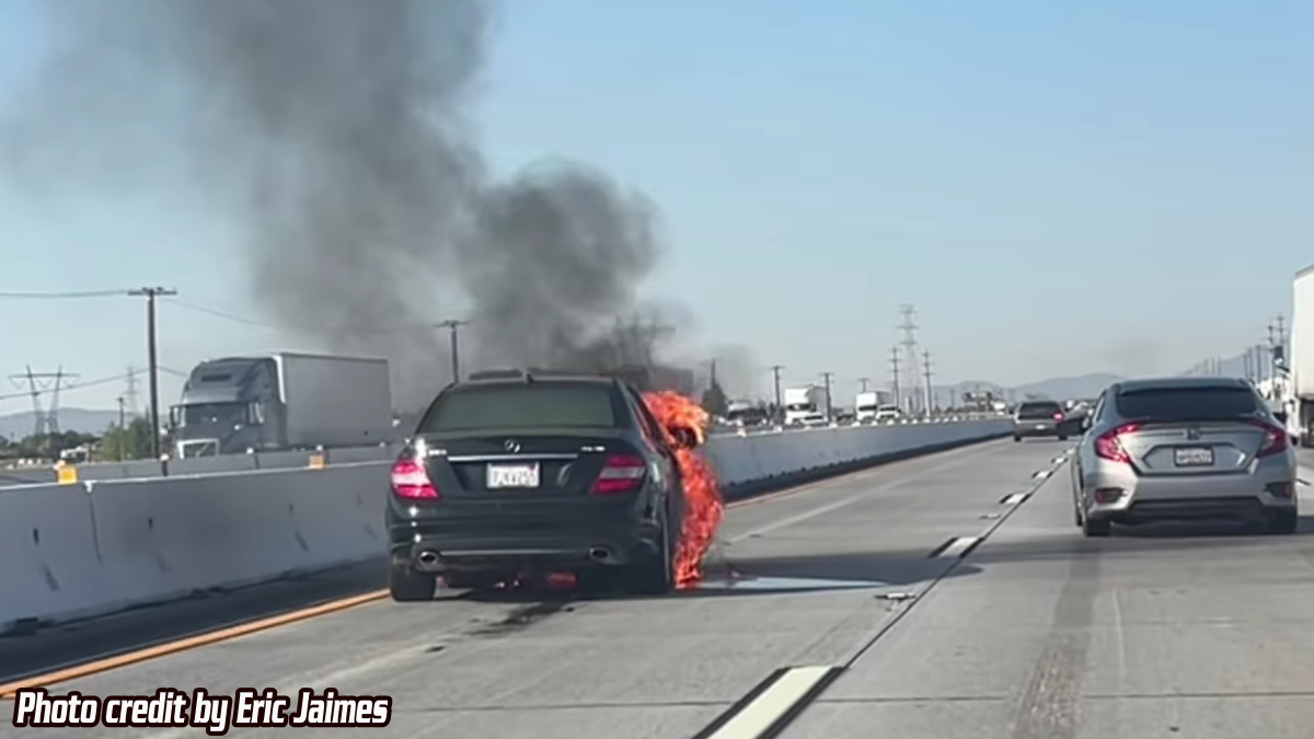 A black Mercedes-Benz sedan stopped in the fast lane of the freeway with flames coming from the engine compartment.