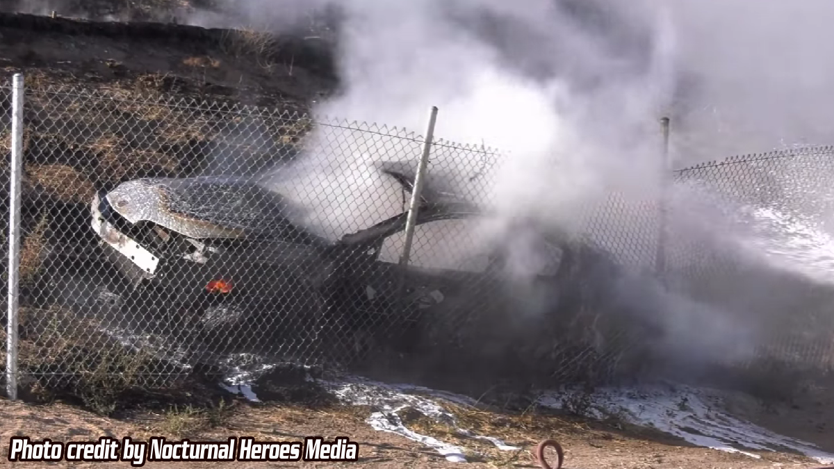 Exactly what led up to the crash is unclear, but the car ended up crashing into the guardrail, rolled completely down the embankment off the freeway and stop next to the chain-link fence next to Mariposa Road. The car then caught fire, but not before the driver was able to escape.