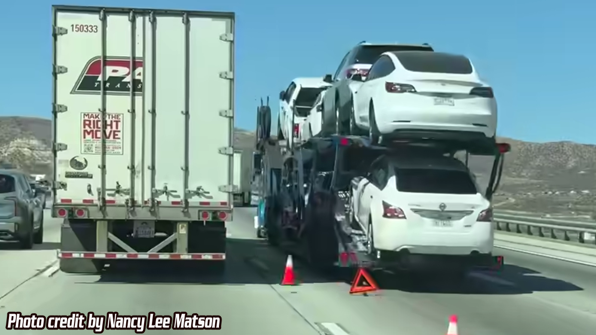 The semi-truck hauling a load of vehicle up the Cajon Pass became disabled is blocking multiple lanes of northbound traffic on I-15 just after the Highway 138 exit at about 2pm on September 15, 2025.