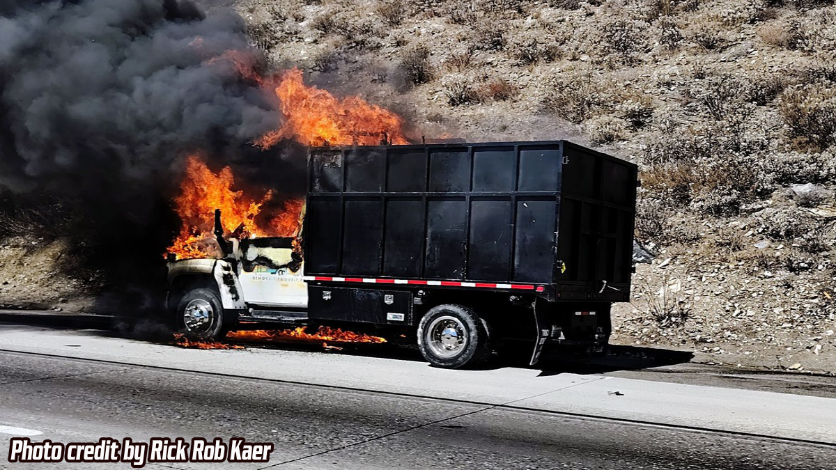 A Chevrolet landscape dump truck pulled over to the right shoulder of the freeway with flames coming from the engine compartment.