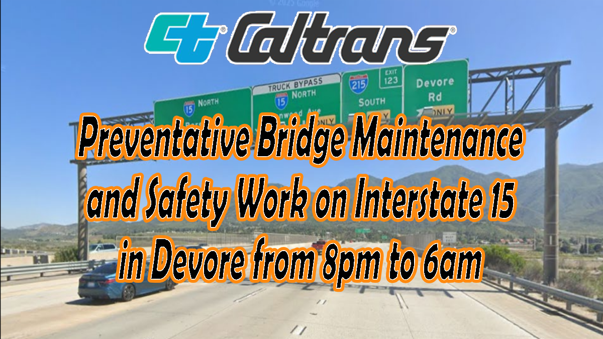 DEVORE, CA. (Pain In The Pass) >> The California Department of Transportation (Caltrans) is alerting the public that construction contractors will continue to work on the $1.67 M project on Interstate 15 (I-15) in San Bernardino County at Devore Heights near junction Interstate 215 (I-215). The purpose of the project is to perform preventive bridge maintenance work which includes furnishing polyester concrete overlay, replacing joint seals, and removing unsound concrete.