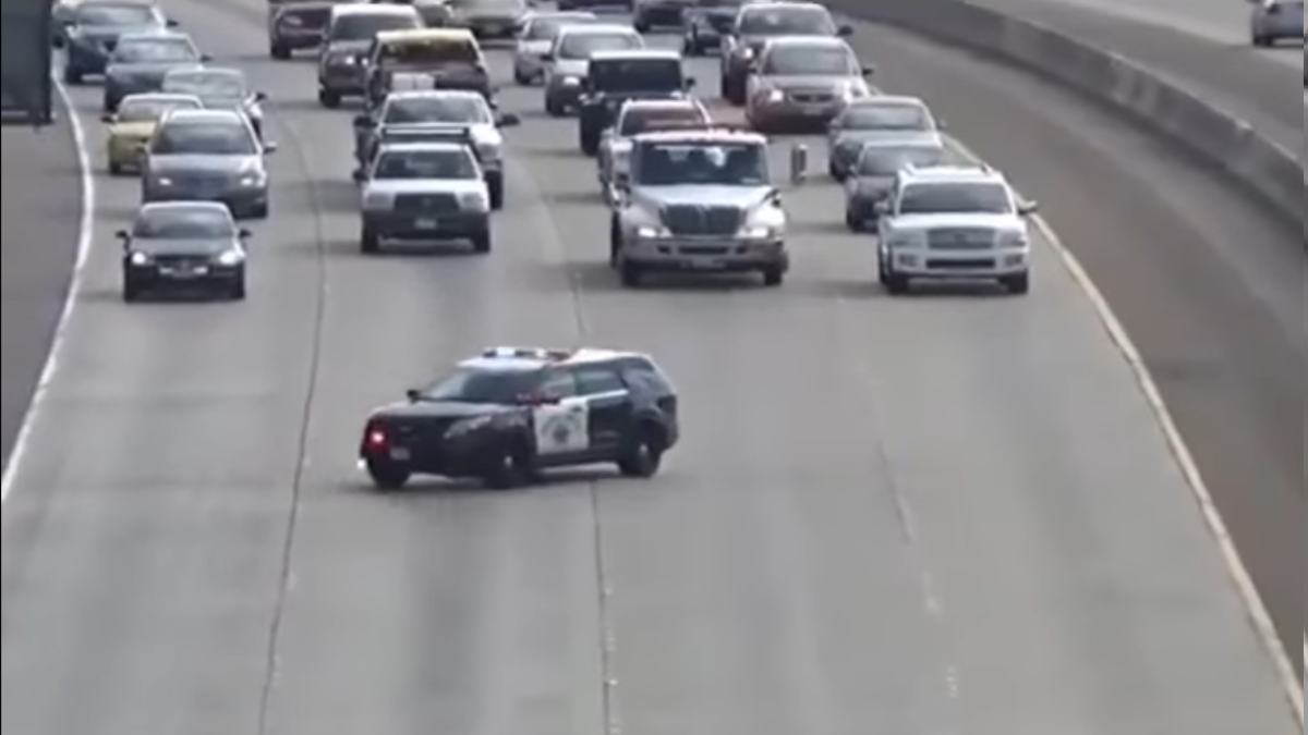 They are performing a “traffic break”. Officers use this driving technique in order to slow and/or stop all lanes of traffic for one of many possible reasons. These reasons include, but are not limited to: debris in the roadway ahead, a traffic collision ahead, people standing in lanes ahead, a stalled vehicle blocking lanes ahead, an animal in lanes, police activity, a fire, roadwork by Caltrans, and etc.