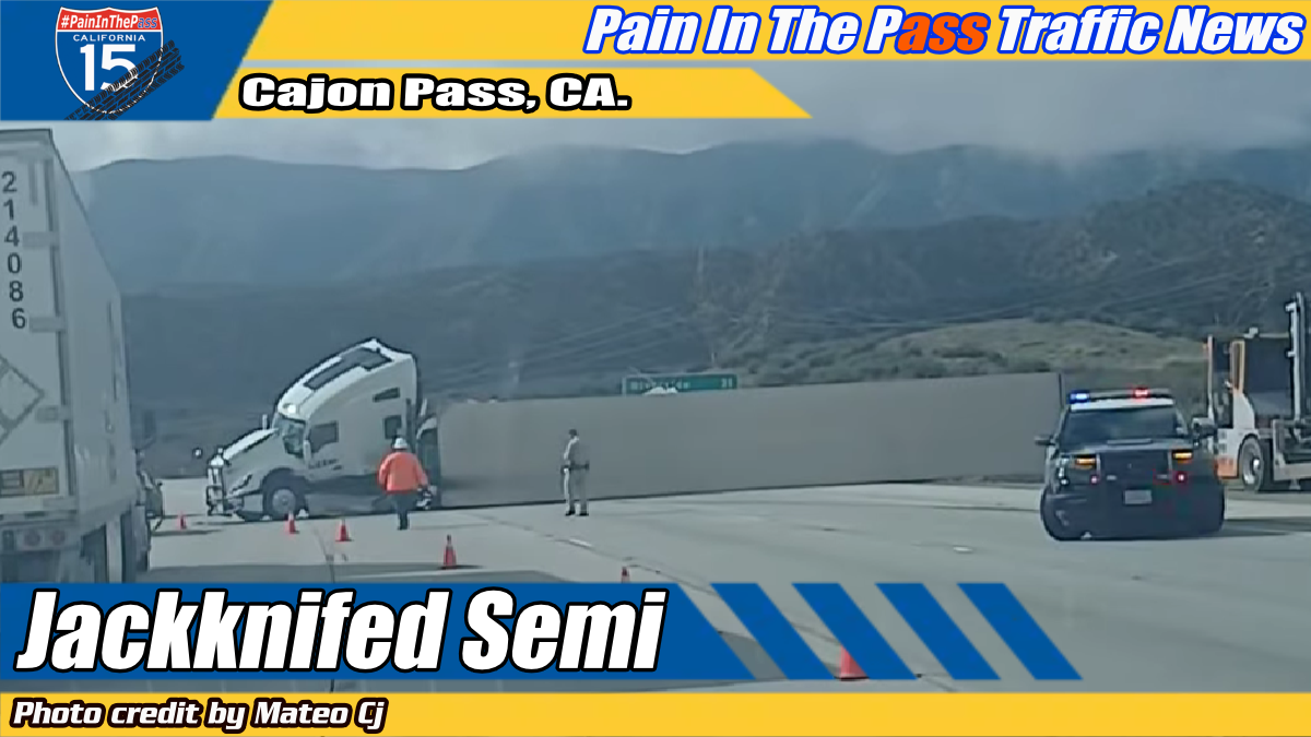 CAJON PASS, CA. (Pain In The Pass) >> A semi tractor-trailer jackknifed cause the trailer to overturned Monday on southbound Interstate 15 in the Cajon Pass during the late morning/afternoon commute.