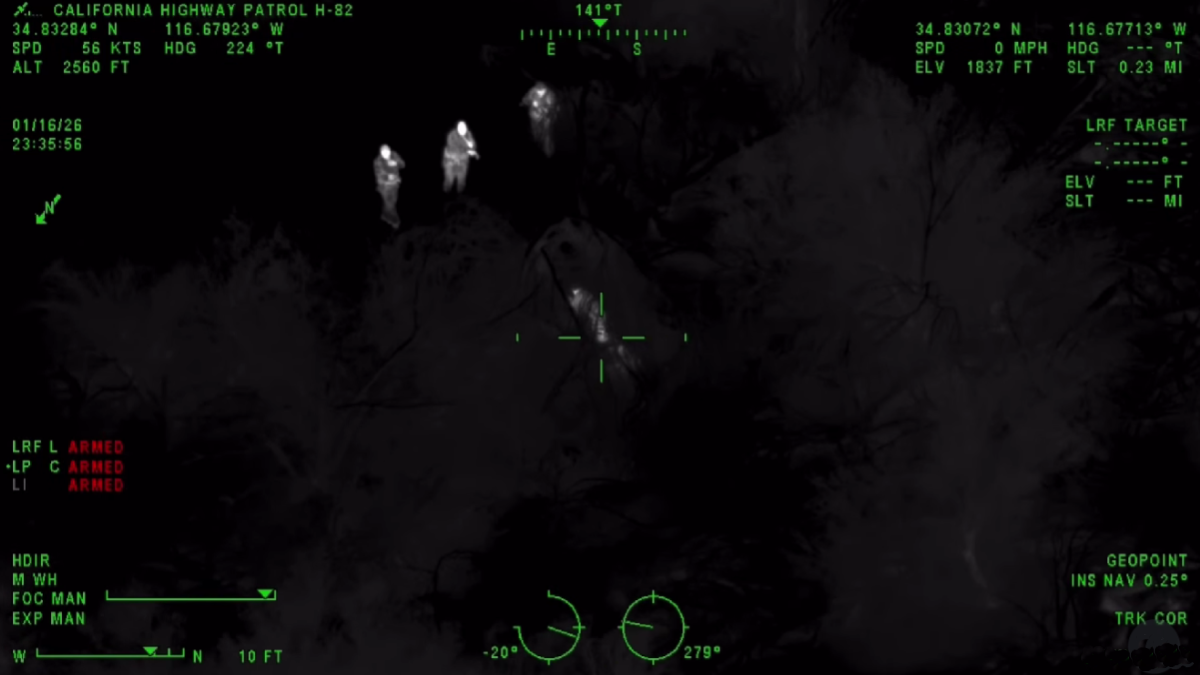 Utilizing infrared technology, CHP Helicopter H-82 located one suspect concealed in heavy brush. Ground units safely responded and the suspect was detained without incident.