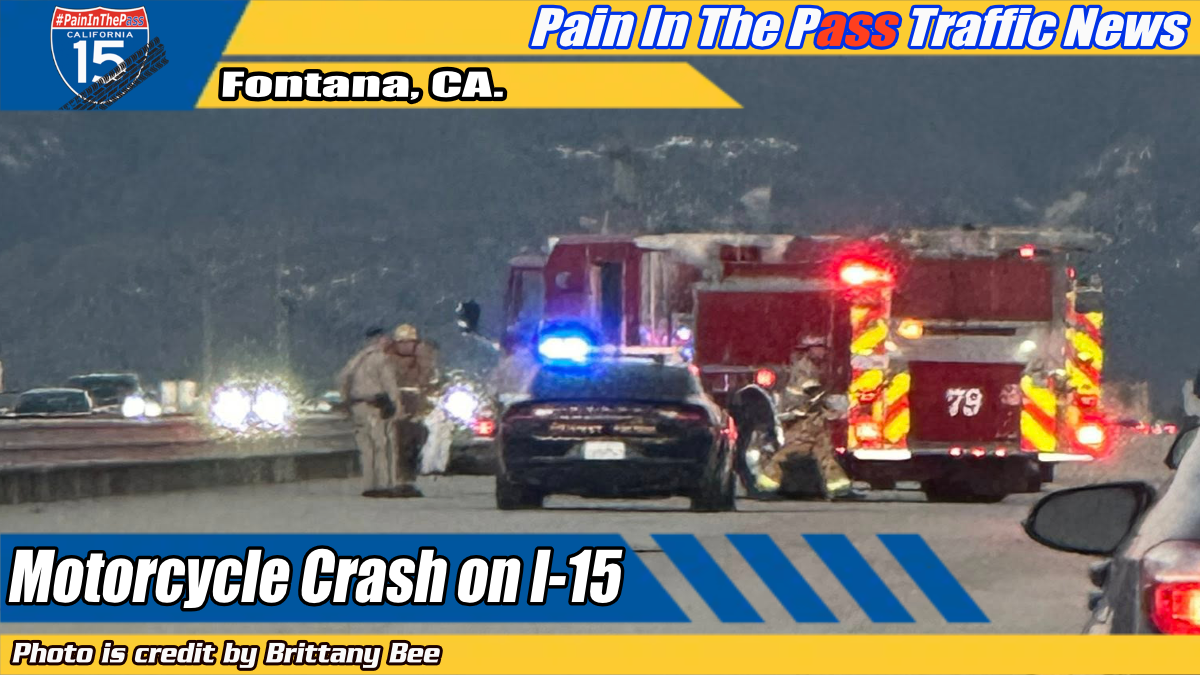 FONTANA, CA. (Pain In The Pass) >> Emergency personnel responded to a three-vehicle crash involving a motorcycle on Northbound Interstate 15 in Fontana during the Friday evening commute.