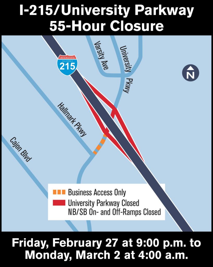 • University Parkway will be closed between NB and SB I-215 ramps (under the freeway)