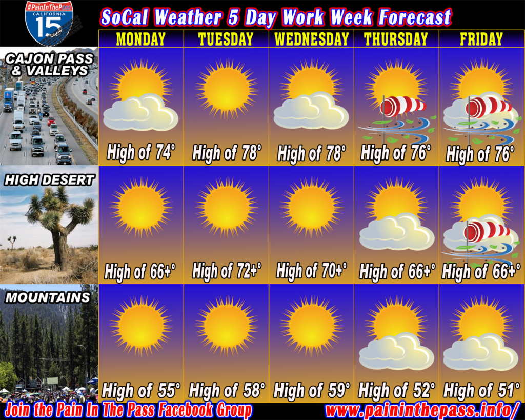 SOUTHERN CALIFORNIA, CA. (Pain In The Pass) >> This week’s weather forecast for Monday March 2 through Friday March 6 for Southern California. Check out the 5-day forecast below in your area.