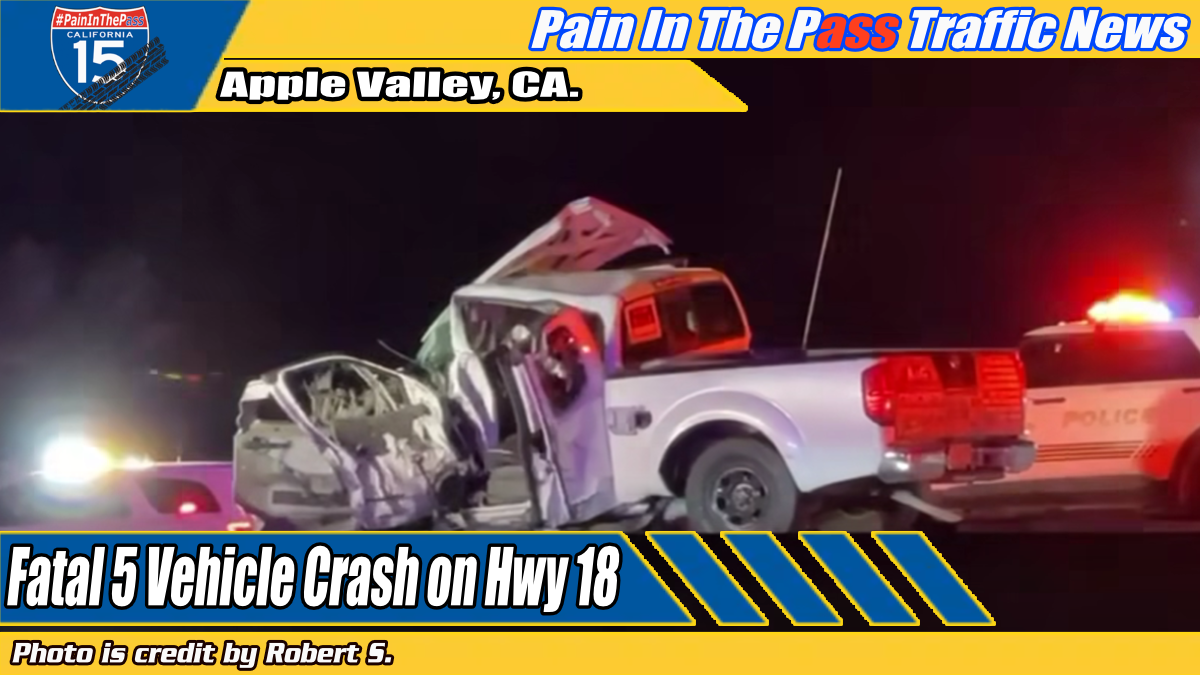 APPLE VALLEY, CA. (Pain In The Pass) >> One person was killed and two people were injured in a five-vehicle crash on Highway 18 Saturday night, according to Apple Valley Police Department.