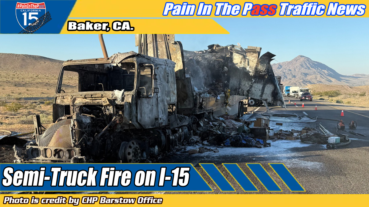 BAKER, CA. (Pain In The Pass) >> A semi-truck fire shut down a stretch of Interstate 15 outside the town of Baker Wednesday morning, causing heavy traffic delays.