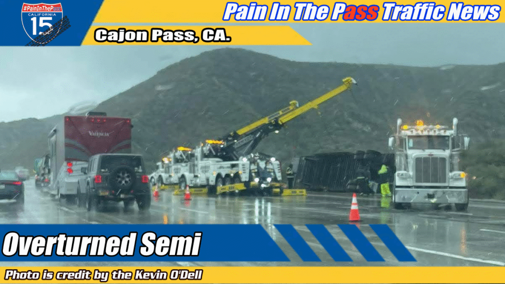 CAJON PASS, CA. (Pain In The Pass) >> A semi-truck crash Thursday morning left the driver injured and shut down lanes on Interstate 15 in the Cajon Pass for more