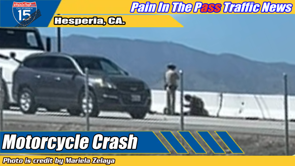 HESPERIA, CA. (Pain In The Pass) >> One person was injured today when a motorcycle collided with a car on the Interstate 15 Friday afternoon on Friday afternoon. The crash