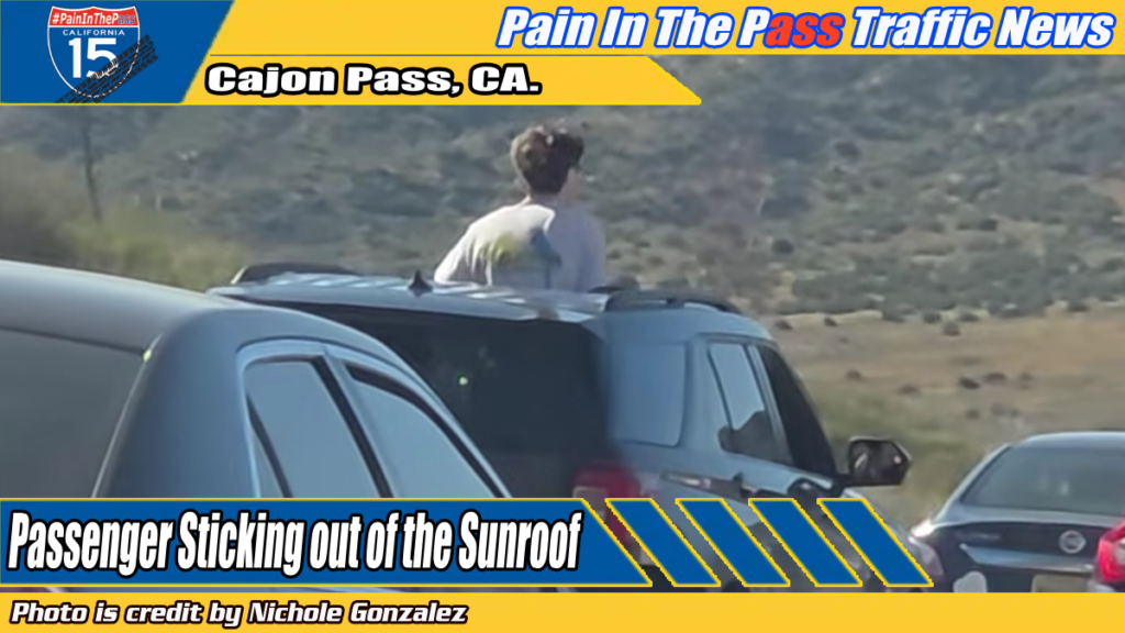 CAJON PASS, CA. (Pain In The Pass) >> – A video of a passenger sticking out of the sunroof of a slow-moving freeway in the Cajon Pass Saturday afternoon. In