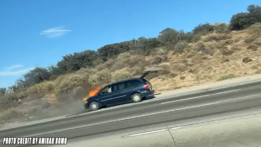 CAJON PASS, CA. (Pain In The Pass) >> A blue mini-van was on fire, backed up traffic on Wednesday evening commute at the top of the Cajon Pass. California Highway