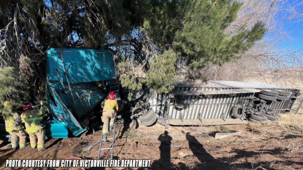 VICTORVILLE, CA. (Pain In The Pass) >> A big-rig driver has serious injuries after his truck went off southbound Interstate 15 and into some trees Sunday morning in the city
