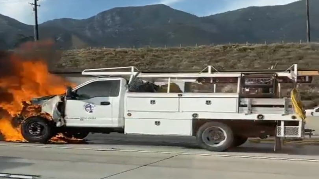 CAJON PASS, CA. (Pain In The Pass) >> San Bernardino County firefighters work the scene of a work truck fire shortly after 6pm on Thursday evening in the northbound lanes