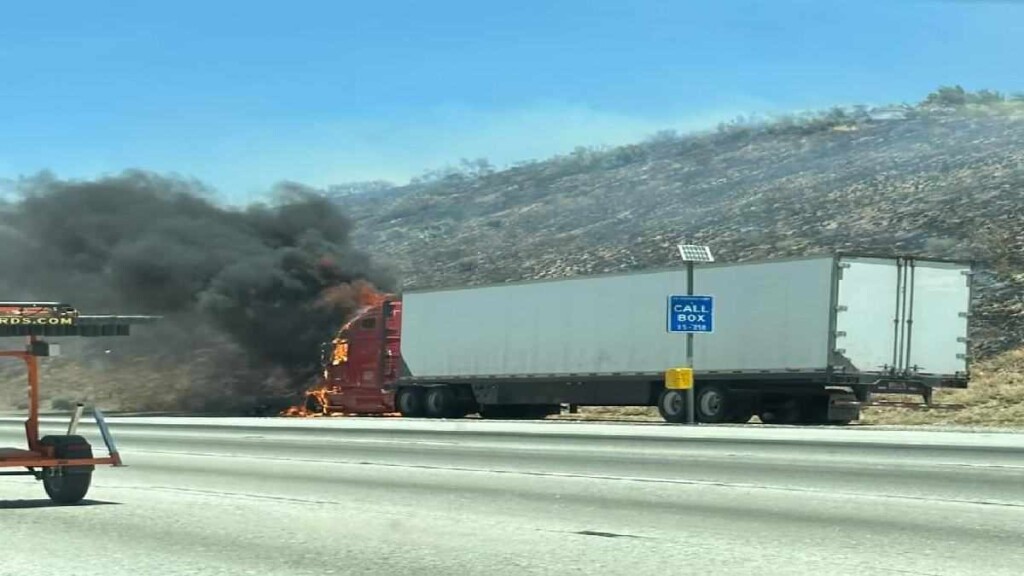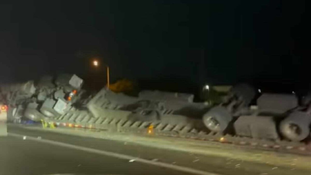 HESPERIA, CA. (Pain In The Pass) >> An overturned big rig carrying a full load of steel I-beams Wednesday morning, according to the California Highway Patrol. (Photo above is credit