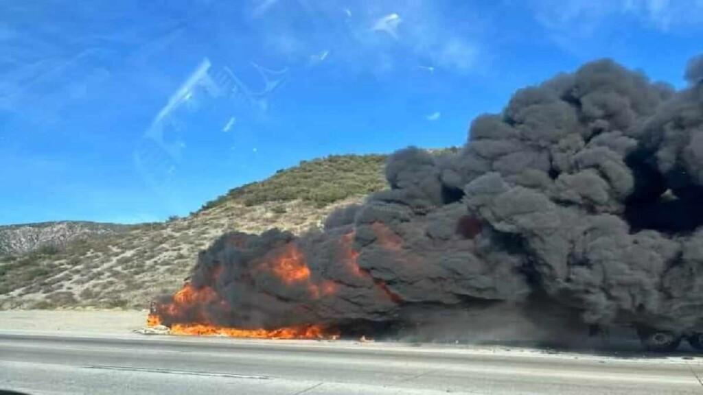 CAJON PASS, CA. (Pain In The Pass) >> A semi tractor trailer fire in the Cajon Pass Friday afternoon temporarily closes the lanes of the northbound Interstate 15. (Photo above