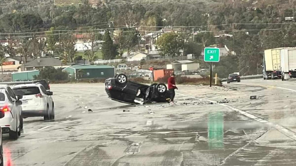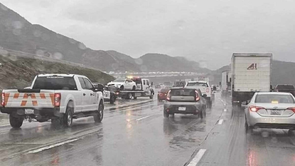 DEVORE, CA. (Pain In The Pass) >> A hit-and-run crash on Monday afternoon shut down the slow lane of northbound Interstate 15 near the 15/215 split. (Photo above is credit