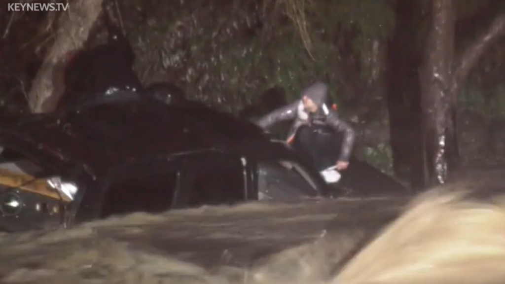 CAJON PASS, CA. (Pain In The Pass) >> Three people were rescued from a flooded road in the Cajon Pass early Monday morning. San Bernardino County firefighters Swift-Water Crews responded