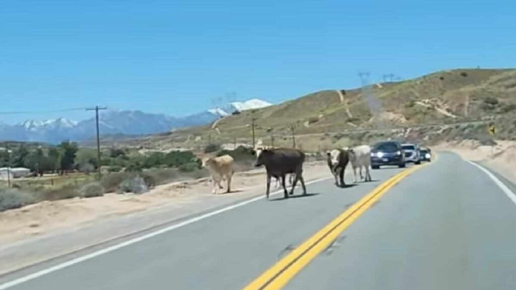 HESPERIA, CA. (Pain In The Pass) >> Here’s something you don’t see every day. A small herd of cows running down on Summit Valley Road in Hesperia. (Photo above is
