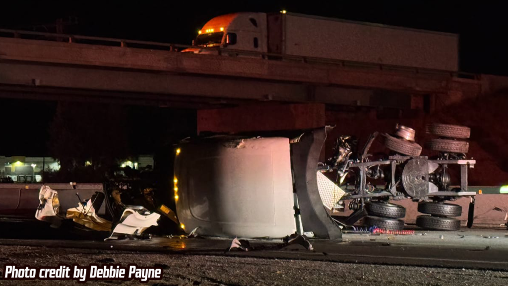 HESPERIA, CA. (Pain In The Pass) >> A semi driver is injured Sunday morning apparently losing control and hitting a bridge pillar holding up Joshua Street in Hesperia. The crash