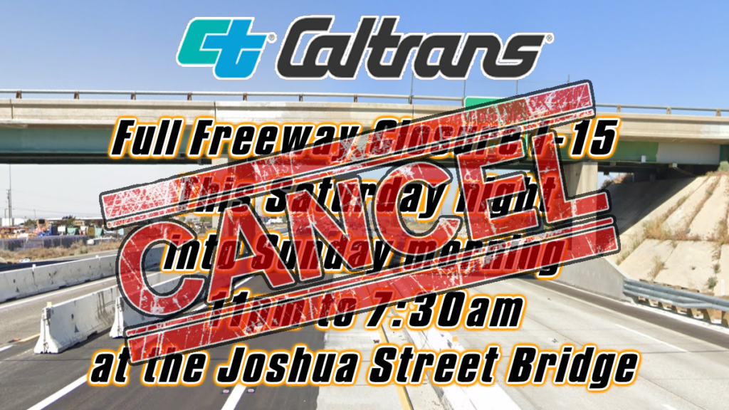 Update from Caltrans on Monday. The I-15 Joshua St. Bridge project in Hesperia is canceled at this time no rescheduled date at this. HESPERIA, CA. (Pain In The Pass) >>