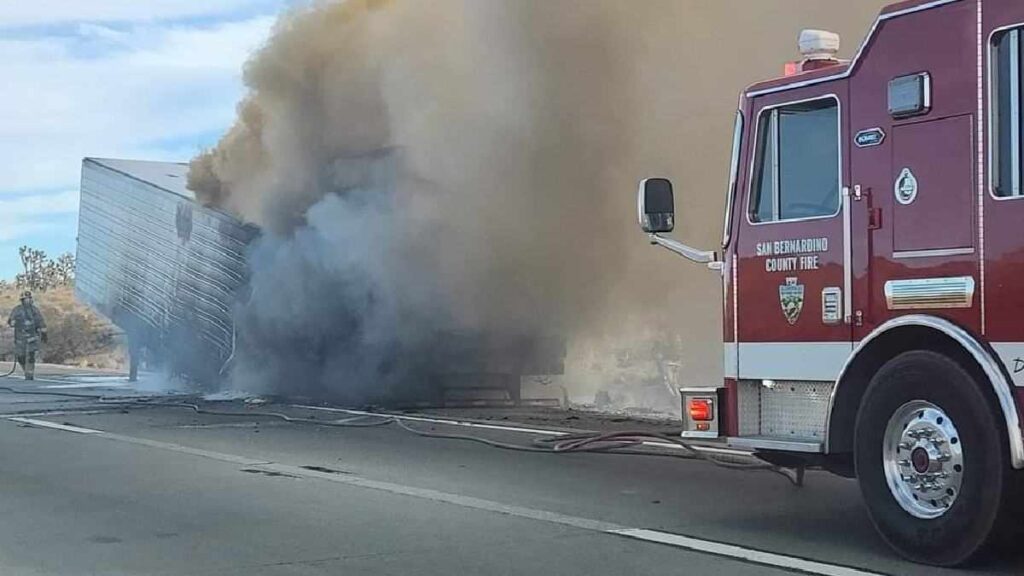 BAKER, CA, (Pain In The Pass) >> A semi-trailer burst into flames Saturday afternoon along Interstate 15 near Stateline. (Photo above is credit by Rob Gold) The fire happened in