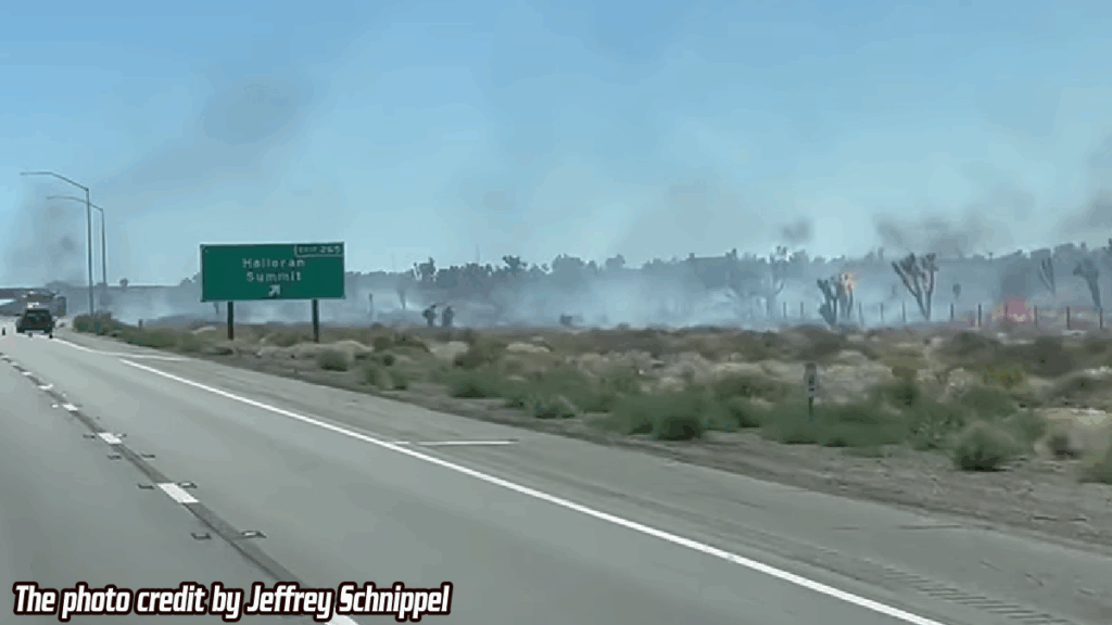 BAKER, CA. (Pain In The Pass) >> A vehicle fire spread to vegetation along southbound Interstate 15 Saturday afternoon. The fire started around 1:41pm on July 5, 2025, on southbound