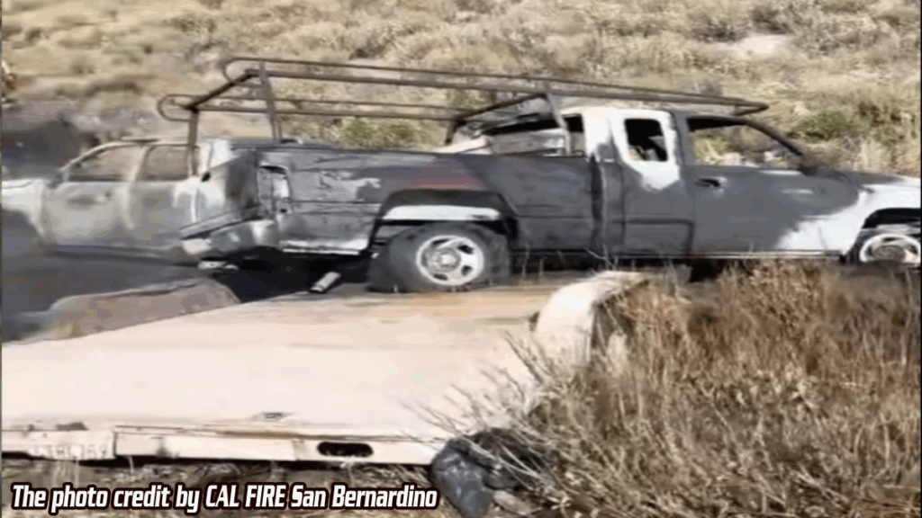 SAN BERNARDINO, CA. (Pain In The Pass) >> Thedriver of a pickup truck towing another truck on a trailer attempted to avoid wood debris in the roadway, lost control, and