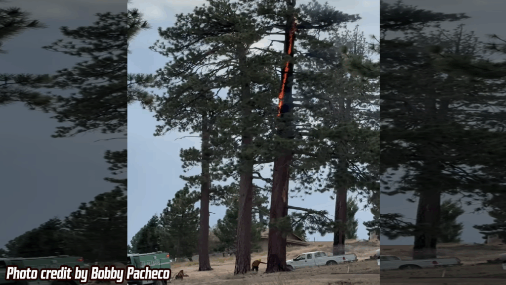 WRIGHTWOOD, CA. (Pain In The Pass) >> A lightning strike during a thunderstorm Saturday morning caused a pine tree on fire in the Angeles National Forest near the town of
