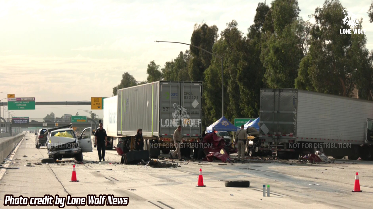 CHP investigators said the preliminary investigation reveals traffic had slowed or stopped when the driver of a red semi tractor-trailer allegedly failed to stop on time, leading to a chain-reaction crash that involved eight vehicles. Four of the eight vehicles were commercial vehicles.