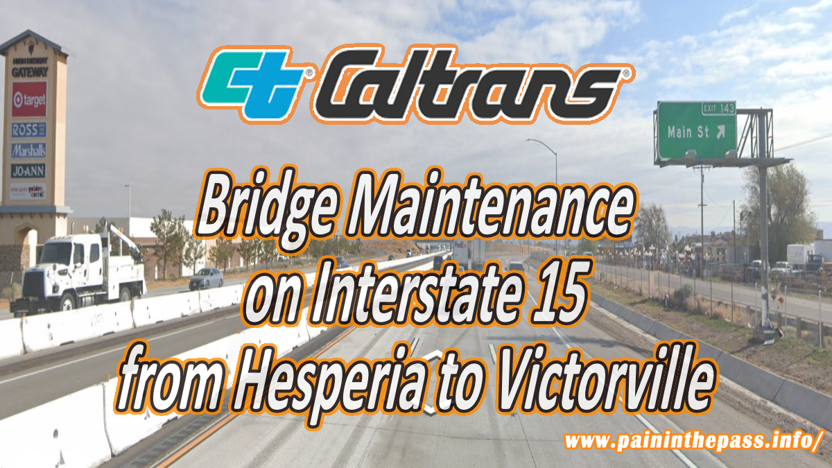 HESPERIA, CA. (Pain In The Pass) >> The California Department of Transportation (Caltrans) alerts the public that Specialized Bridge Maintenance crews will perform a series of bridge operations on Interstate 15 (I-15) from Hesperia to Victorville. If Weather permitting.
