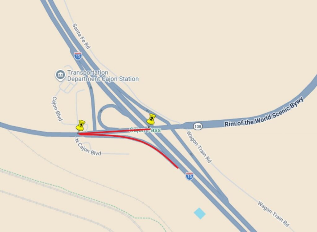 This operation will require a closure of the Hwy 138 #2 lane and a closure of the Hwy 138 to southbound Interstate 15 on ramp. See map below.