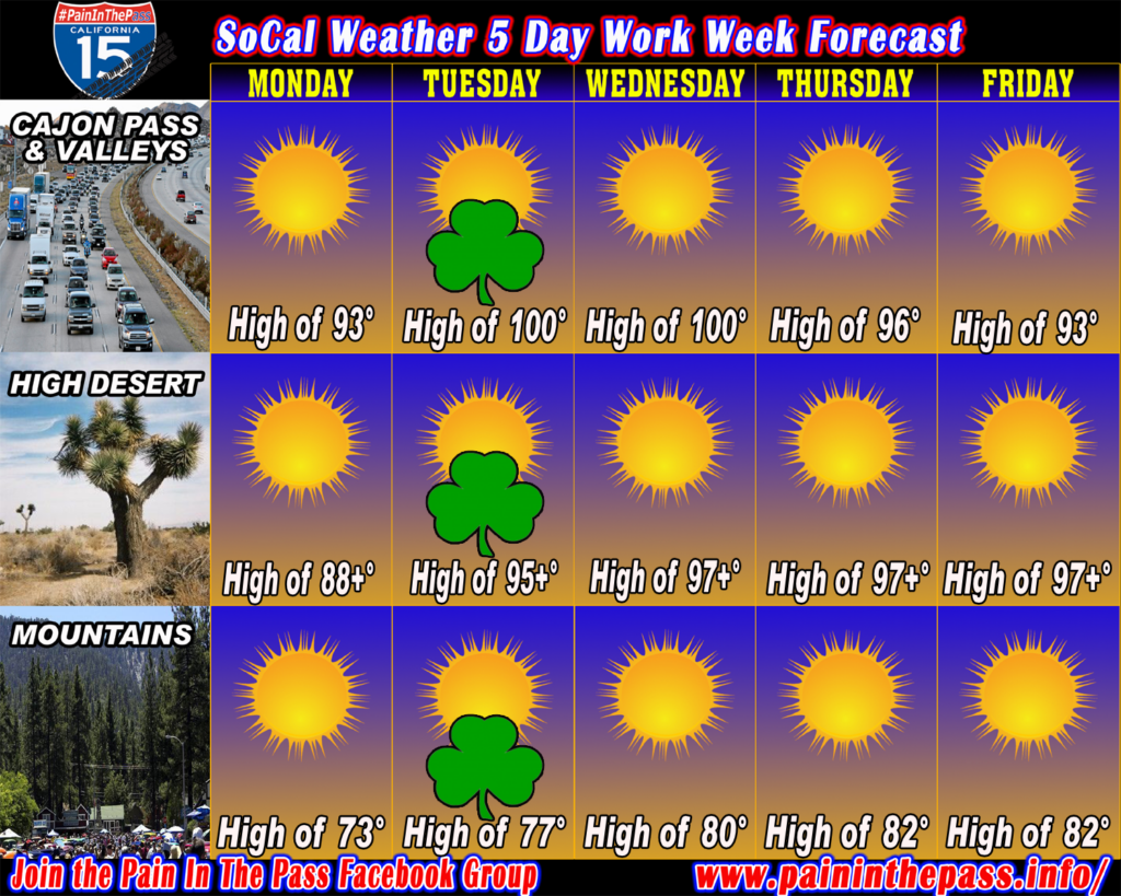 SOUTHERN CALIFORNIA, CA. (Pain In The Pass) >> This week’s weather forecast for Monday March 16 through Friday March 20 for Southern California. Check out the 5-day forecast below in your area.