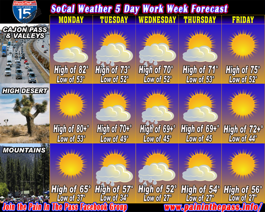 SOUTHERN CALIFORNIA, CA. (Pain In The Pass) >> This week’s weather forecast for Monday March 30 through Friday April 3 for Southern California. Check out the 5-day forecast below in your area.