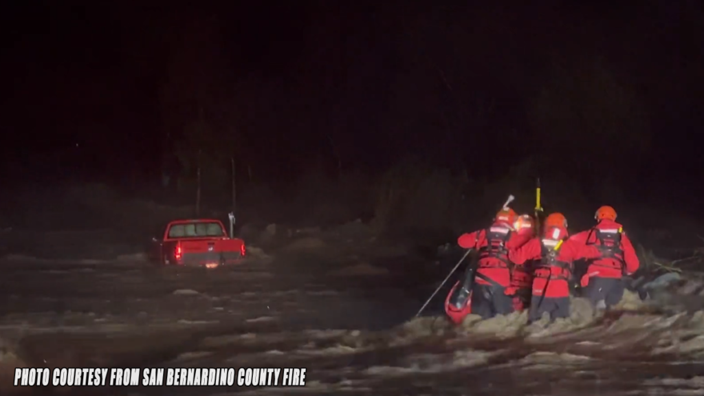 DEVORE, CA. (Pain In The Pass) >> San Bernardino County Fire Department firefighters made a swift water rescue in Devore Friday night as heavy rain fell in the area, causing