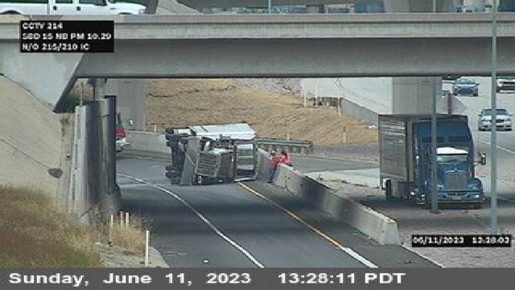 SAN BERNARDINO, CA. (Pain In The Pass) >> Commuters traveling east on the 210 freeway were unable to enter the northbound I-215 ramp earlier today, as a flipped semi tractor-trailer