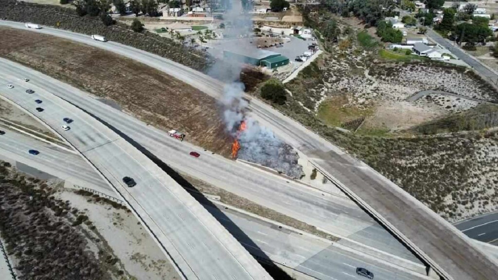 DEVORE, CA. (Pain In The Pass) >> A small brush fire broke out on northbound Interstate 215 at the 15 freeway Saturday afternoon. (Photo above is credit by Theft Task) The
