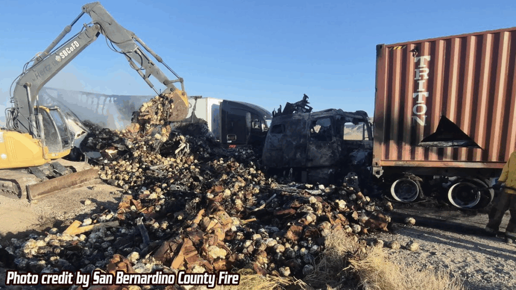 BAKER, CA. (Pain In The Pass) >> Two people were injured Wednesday morning when a semi tractor-trailer rear-ended another and caught fire on northbound Interstate 15, the California Highway Patrol