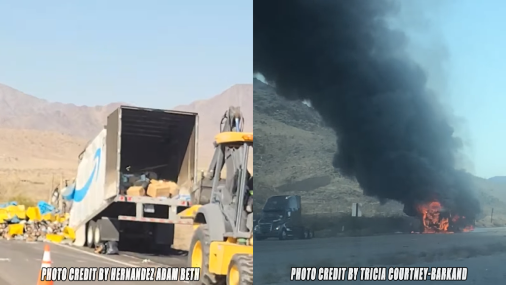 BAKER, CA. (Pain In The Pass) >> Traffic on Interstate 15 is backed up for miles for cleanup after two big rigs caught fire on Tuesday morning and this afternoon.