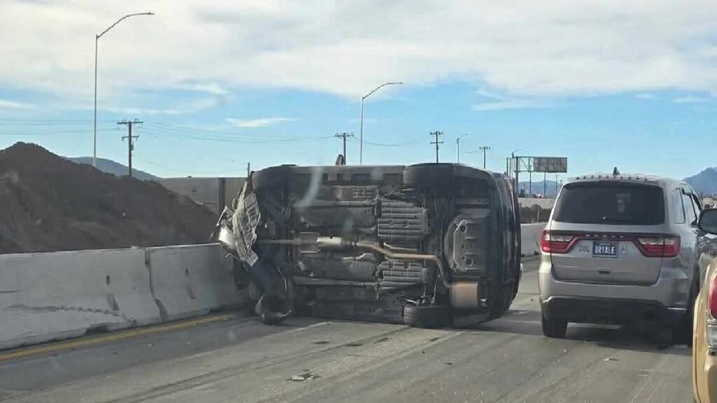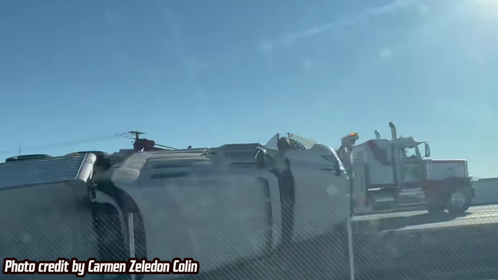 HESPERIA, CA. (Pain In The Pass) >> A traffic collision resulted to one vehicle to overturn on the southbound Interstate 15 Saturday morning. (Photo above is credit by Rosie Ramirez.)