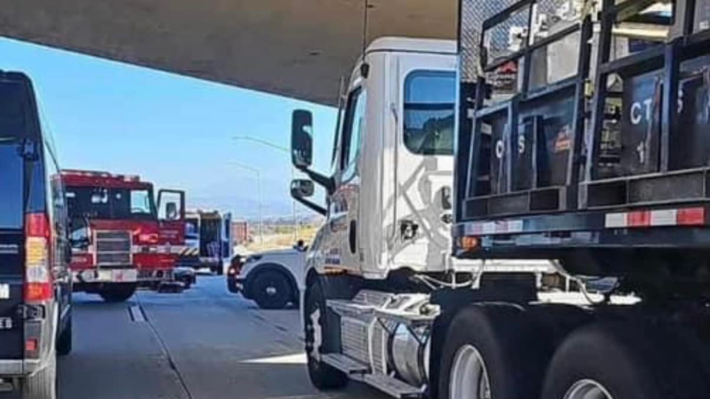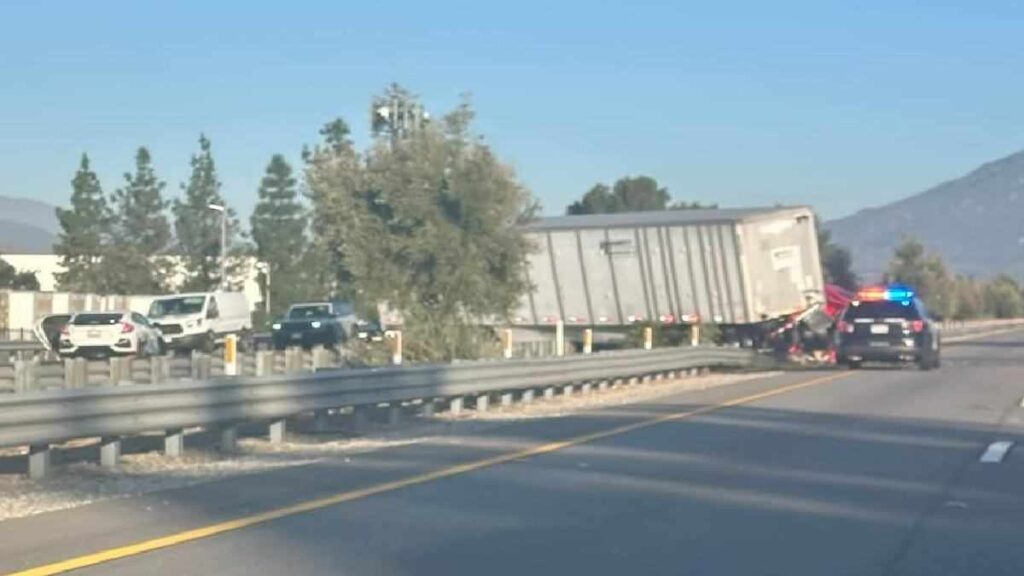 SAN BERNARDINO, CA. (Pain In The Pass) >> An semi-truck crashed into a guardrail Thursday morning on southbound Interstate 215. On Thursday May 8, 2025, just after 6am, California Highway