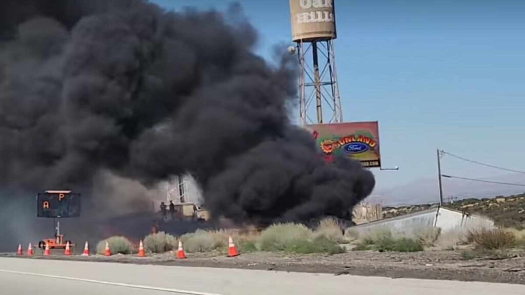MOUNTAIN PASS, CA. (Pain In The Pass) >> What started as a semi-truck fire has turned into a brush in the Mojave Desert, leading to the temporary lane closure of a