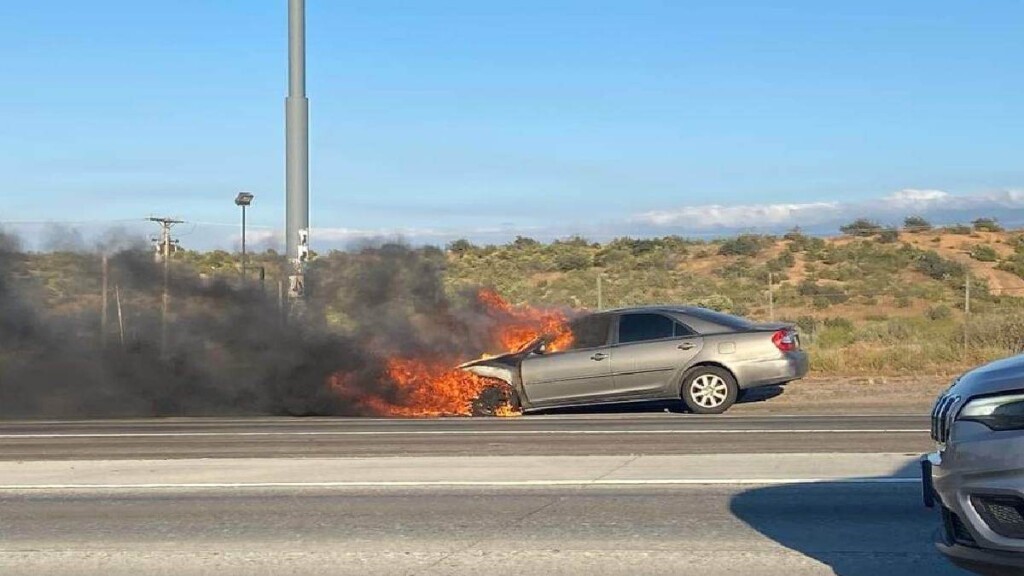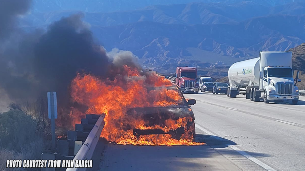 CAJON PASS, CA. (Pain In The Pass) >> A car that went up in flames in the Cajon Pass on Sunday morning. (The photo above is courtesy from Mar Ortega.)