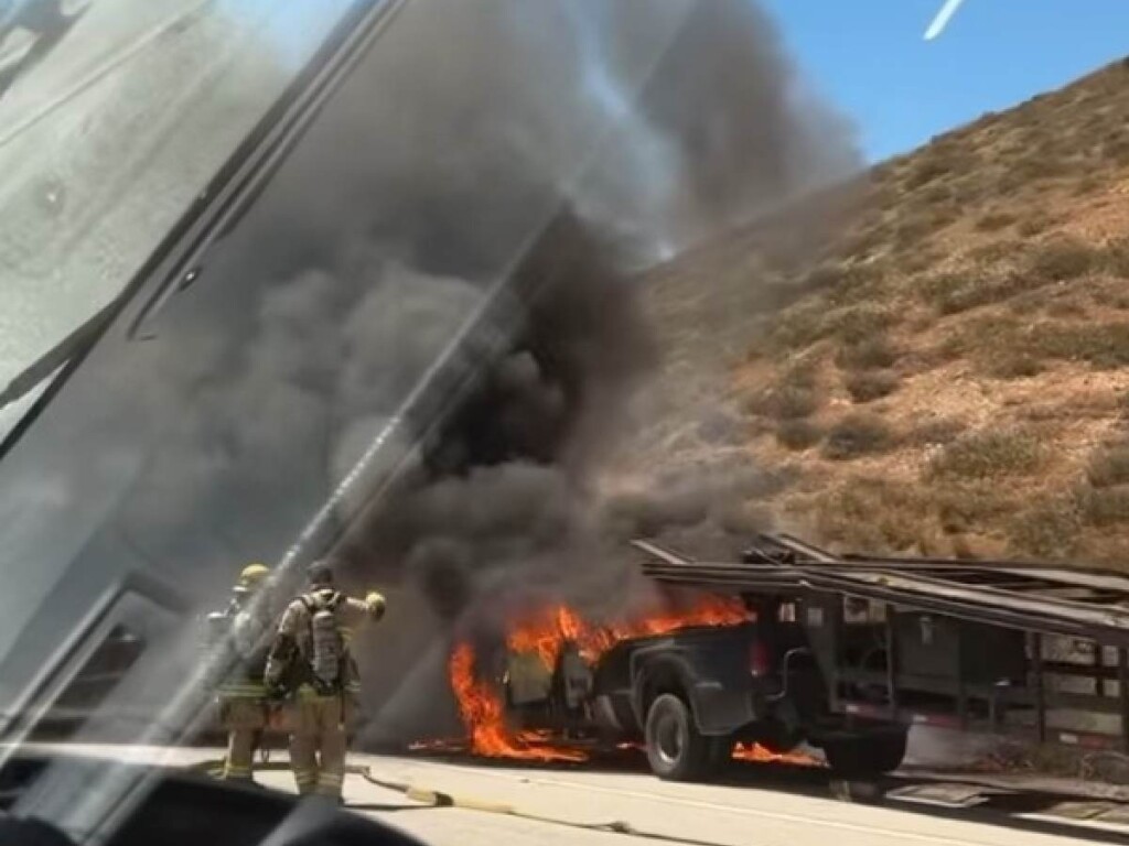 CAJON PASS, CA. (Pain In The Pass) >> A pickup truck pulling a trailer of cars caught fire caused traffic to be backed up on southbound Interstate 15 Friday afternoon.