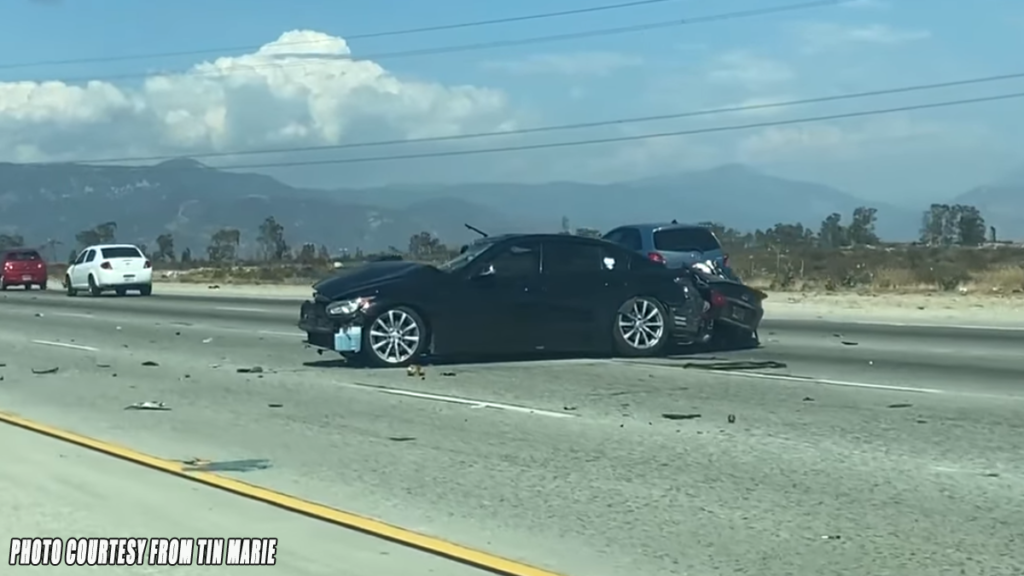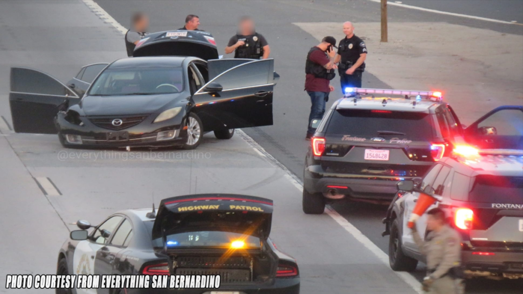 FONTANA, CA. (Pain In The Pass) >> A black sedan driver lost control of his vehicle, which led to hitting a person as they stood next to their vehicle on