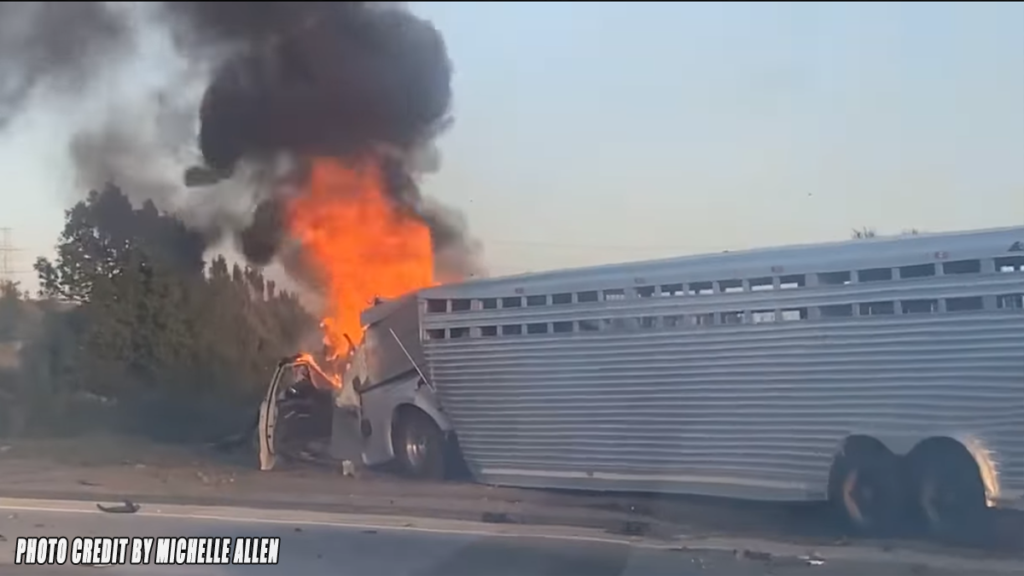 FONTANA, CA. (Pain In The Pass) >> A pickup truck pulling a livestock trailer caught fire after the pickup truck rear-ended a big rig semi trailer on Interstate 15 Saturday